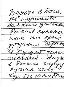 Верьте в Бога. Не слушайте всяких деятелей. Россия сильна как ни одна другая страна и будет только сильнее. Жизнь в России гораздо лучше, чем где бы то ни было. Если это возможно, отправьте мое тело в Россию.